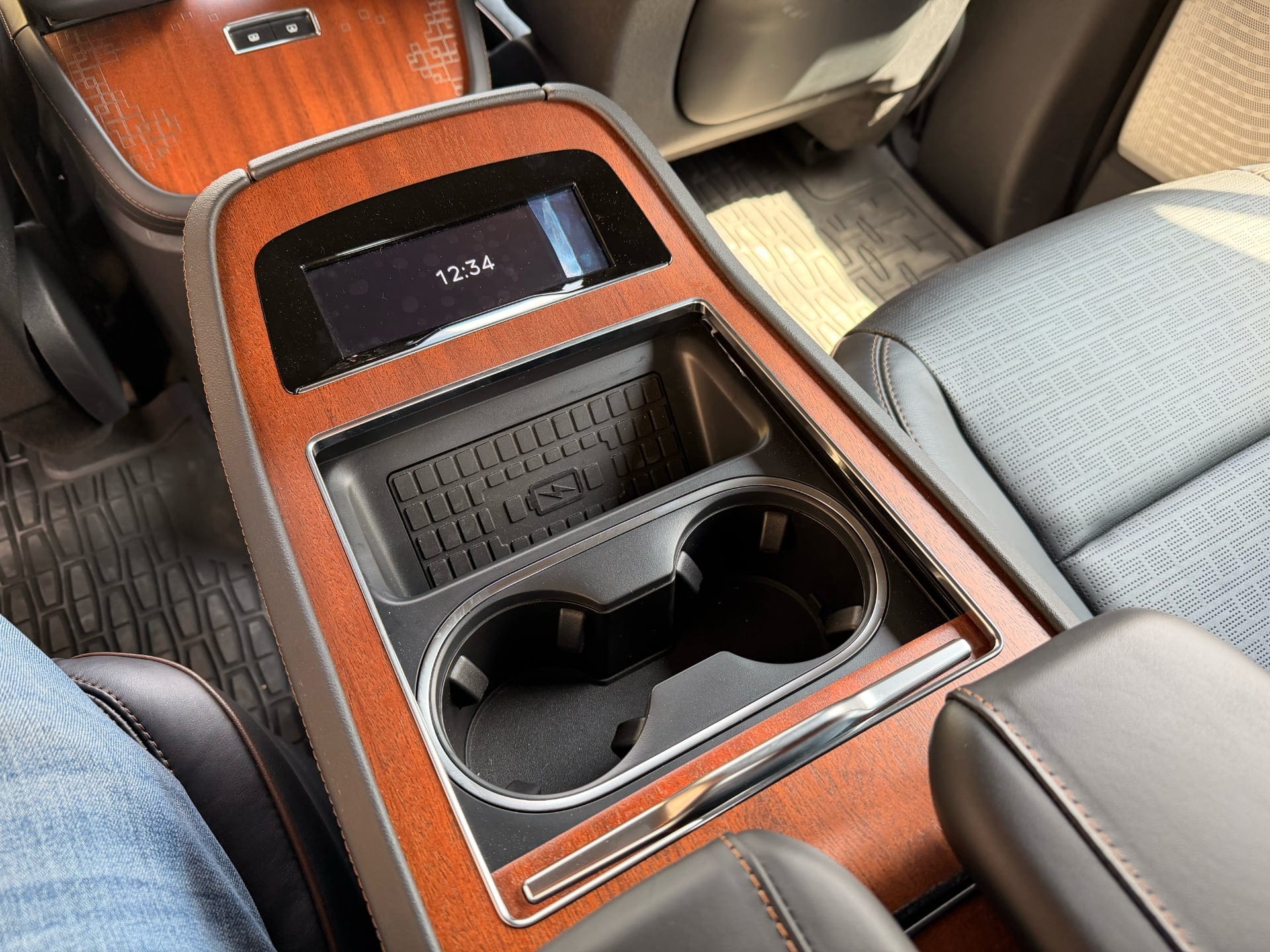 The second-row console between the Captain's Chairs is finished in walnut-effect wood trim with a small embedded display for the time, audio and climate controls, two cup holders, a wireless charging pad, and its own USB and power ports. Rear passengers are genuinely well looked after here.