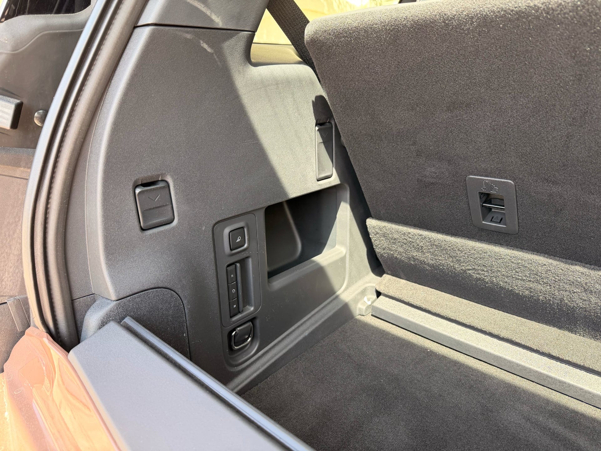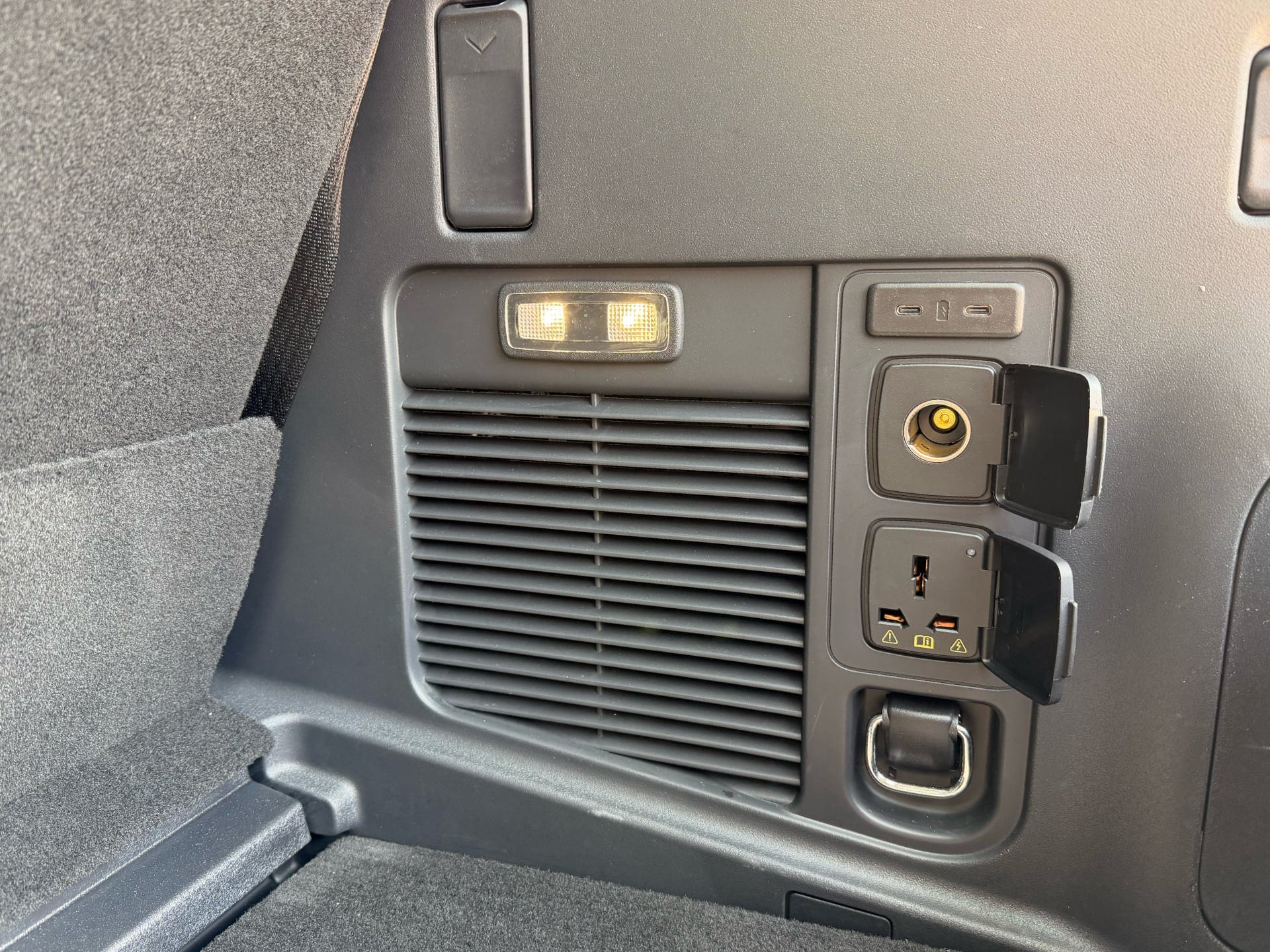 One detail I liked in the boot: a full power outlet suite in the cargo wall — a universal multi-region socket, USB-C ports, and a 12V connection. For anyone who does long UAE road trips and needs to charge or run equipment in the back, that's genuinely useful and not something you typically find at this position in a car. Small thing, right detail.