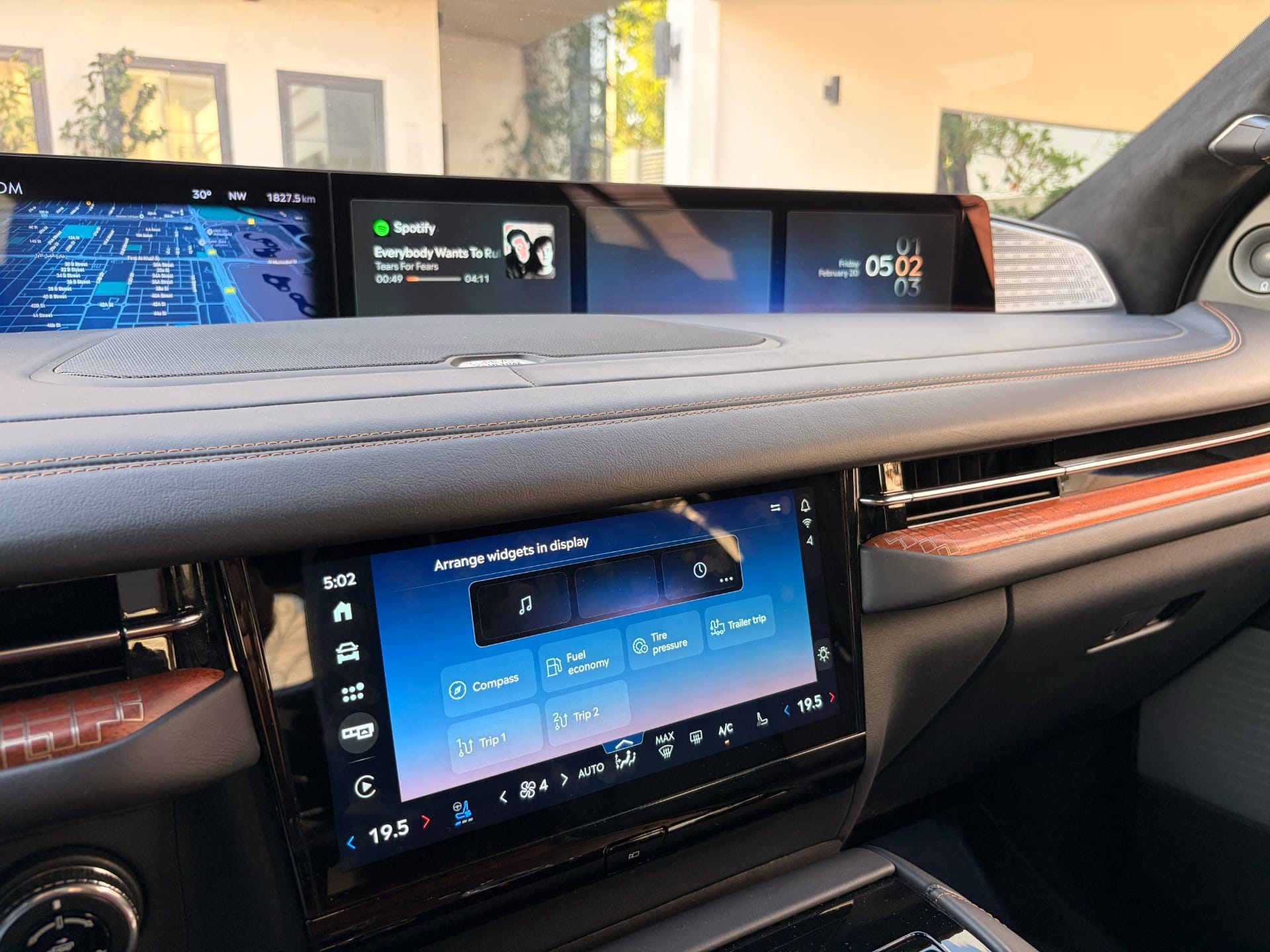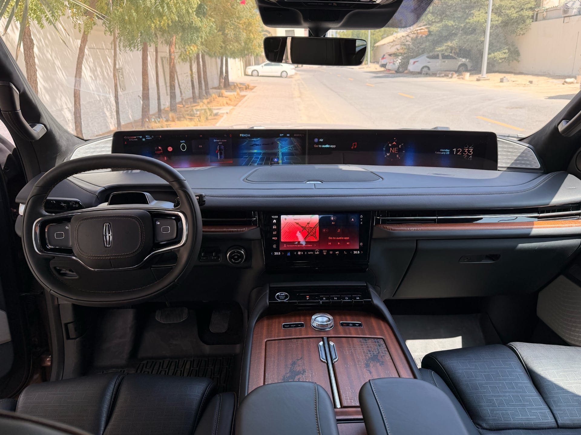 Now. The software. The display splits into a larger left section for navigation and driver information, and a right section with three customisable widgets. The available widget options are: music, fuel economy, compass, tyre pressure, two trip computers, and trailer settings. Trailer settings. On a Dhs 489,000 luxury SUV. There's no calendar widget. No weather. No seat shortcut. The music widget earns its spot; the rest feel like they were borrowed from a Ford Ranger without anyone asking whether they belong here. Lincoln — whoever is responsible for this widget list — needs to be promoted to a different project.