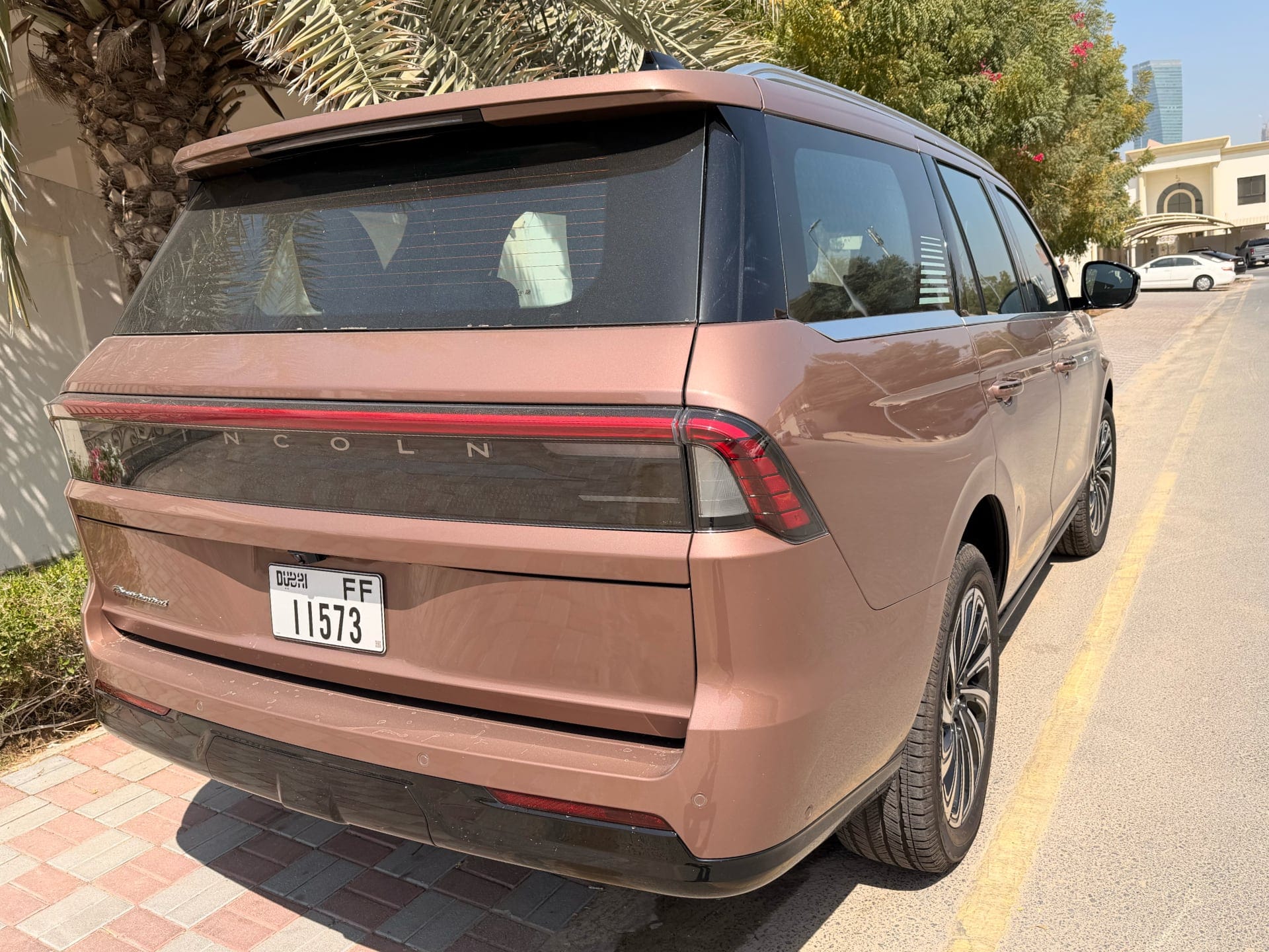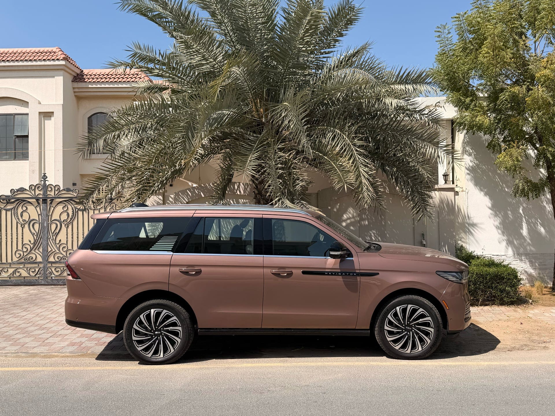 It's a Tuesday afternoon in Dubai, the weather is doing its usual February thing — sunny but not yet the kind of warm that makes you question your life choices. A Sunrise Copper Metallic Lincoln Navigator Presidential is sitting in my driveway, looking like it owns not just the parking space but the street, too. My daughters spot it from inside the house and claim the second row. This was, as it turned out, exactly the right call.