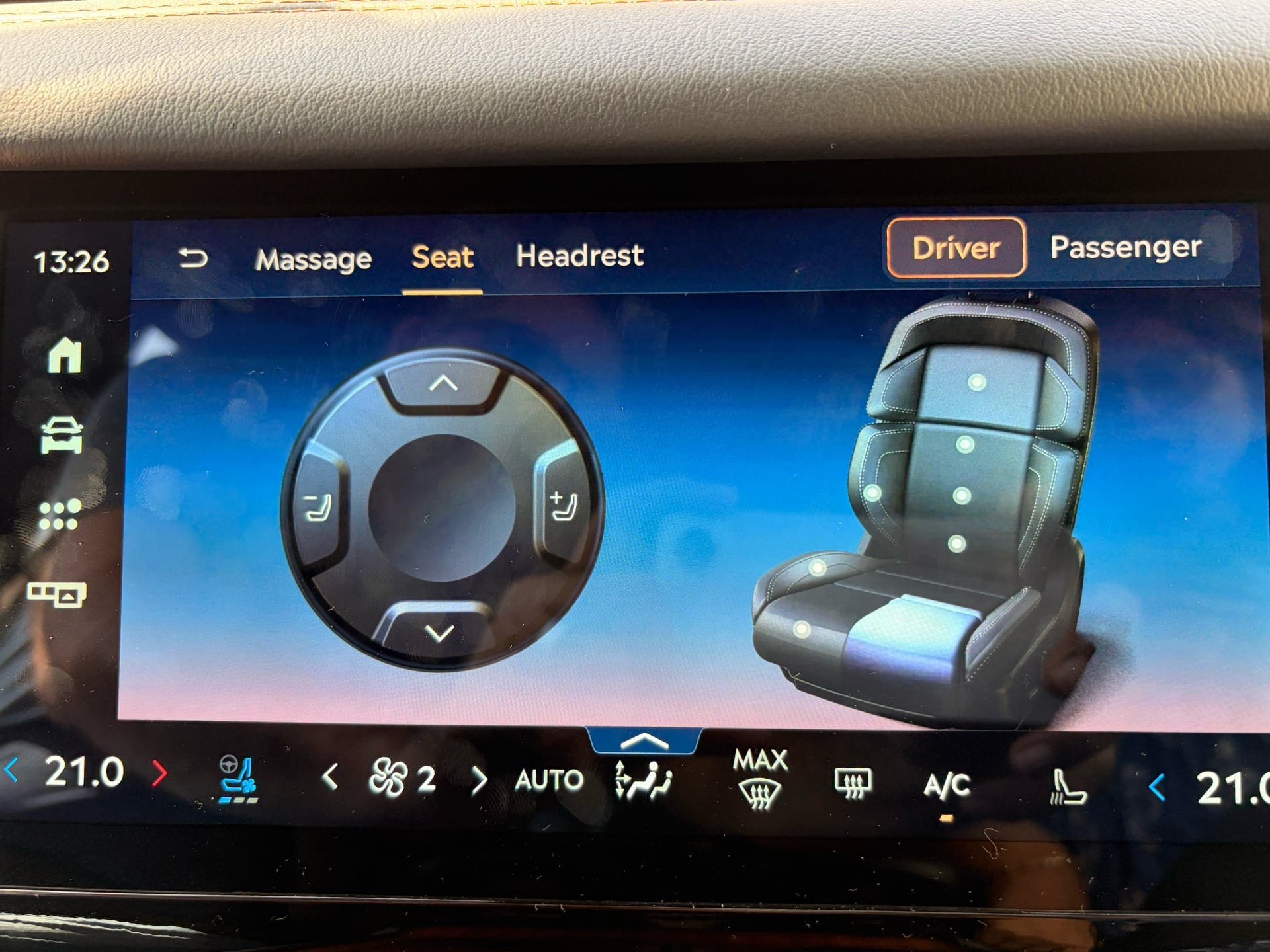 The driver's seat adjusts 30 ways, the passenger's 28, both with massage. And the adjustment system actually has two layers: there are physical controls on the seat base — a dial and two levers — for quick repositioning, and a full touchscreen interface for the finer adjustments. The dial in particular has a premium tactile quality that's satisfying to use. The full menu on the screen, with Massage, Seat, and Headrest tabs plus individual control points, is thorough but not something you'll visit often once you've found your position.