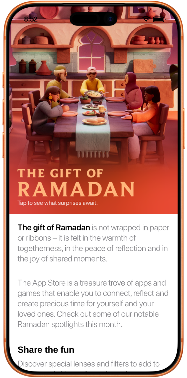 The App Store introduces 'The gift of Ramadan' hub on the Today tab, featuring original stories, in-app events, and seasonal offers. The hub includes three main collections: Ramadan favourites highlighting community-focused apps, Family Sharing-compatible apps for gifting, and featured applications across different categories.