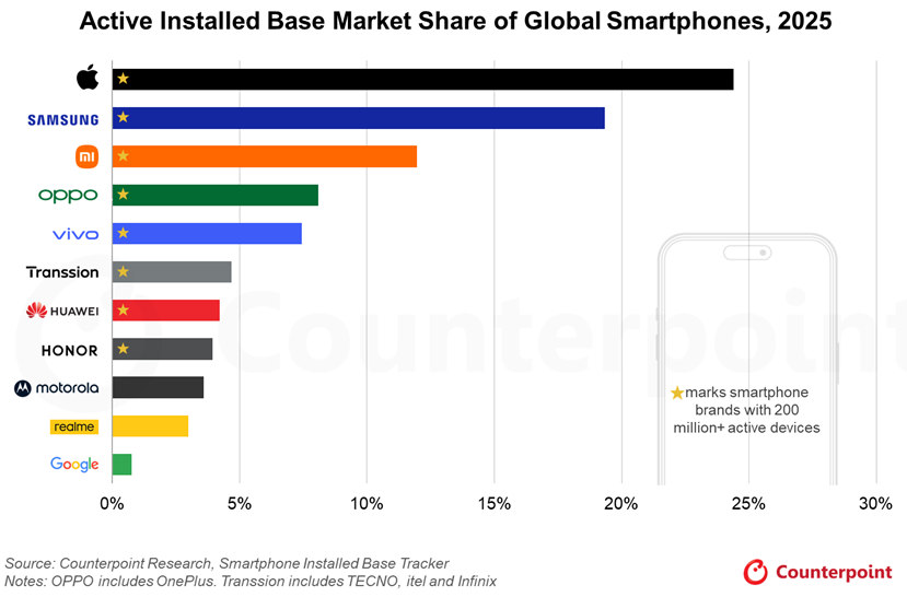 The smartphone market's competitive dynamics are shifting from shipment volumes to long-term user retention, with eight leading OEMs now exceeding 200 million active devices each. According to Counterpoint Research's Smartphone Installed Base Tracker, only Apple and Samsung have crossed the one-billion active devices milestone, with Apple adding more net new devices than the next seven leading OEMs combined in 2025.