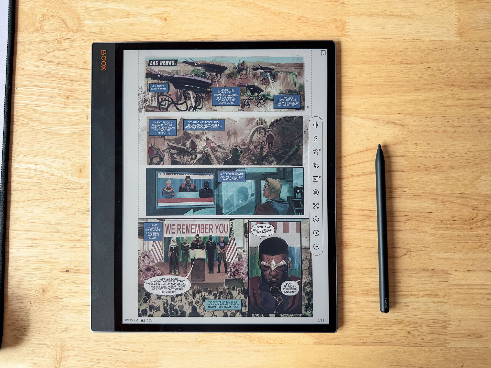 The Tab X C features a 13.3-inch Kaleido 3 colour e-paper display, Boox’s most advanced screen to date. On paper, it offers 300 pixels per inch for black and white content and 150 for colour. In use, the results are more nuanced. Some things look excellent. Others feel like compromises.
