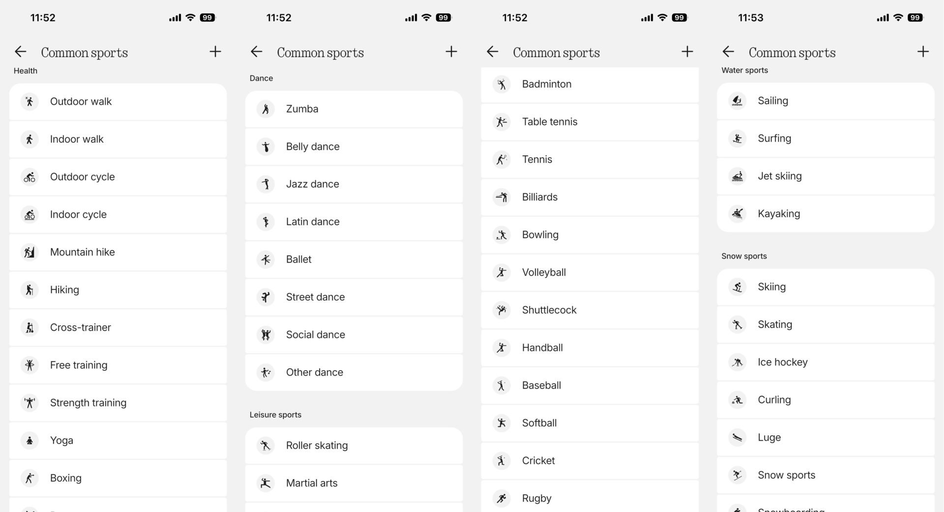 The sports modes include indoor and outdoor walking, cycling, hiking, soccer, basketball, swimming, skiing, cross-trainer, yoga, stair stepper, Pilates, karate, fencing, aerobics, long jump, high jump, dumbbells, and many more.