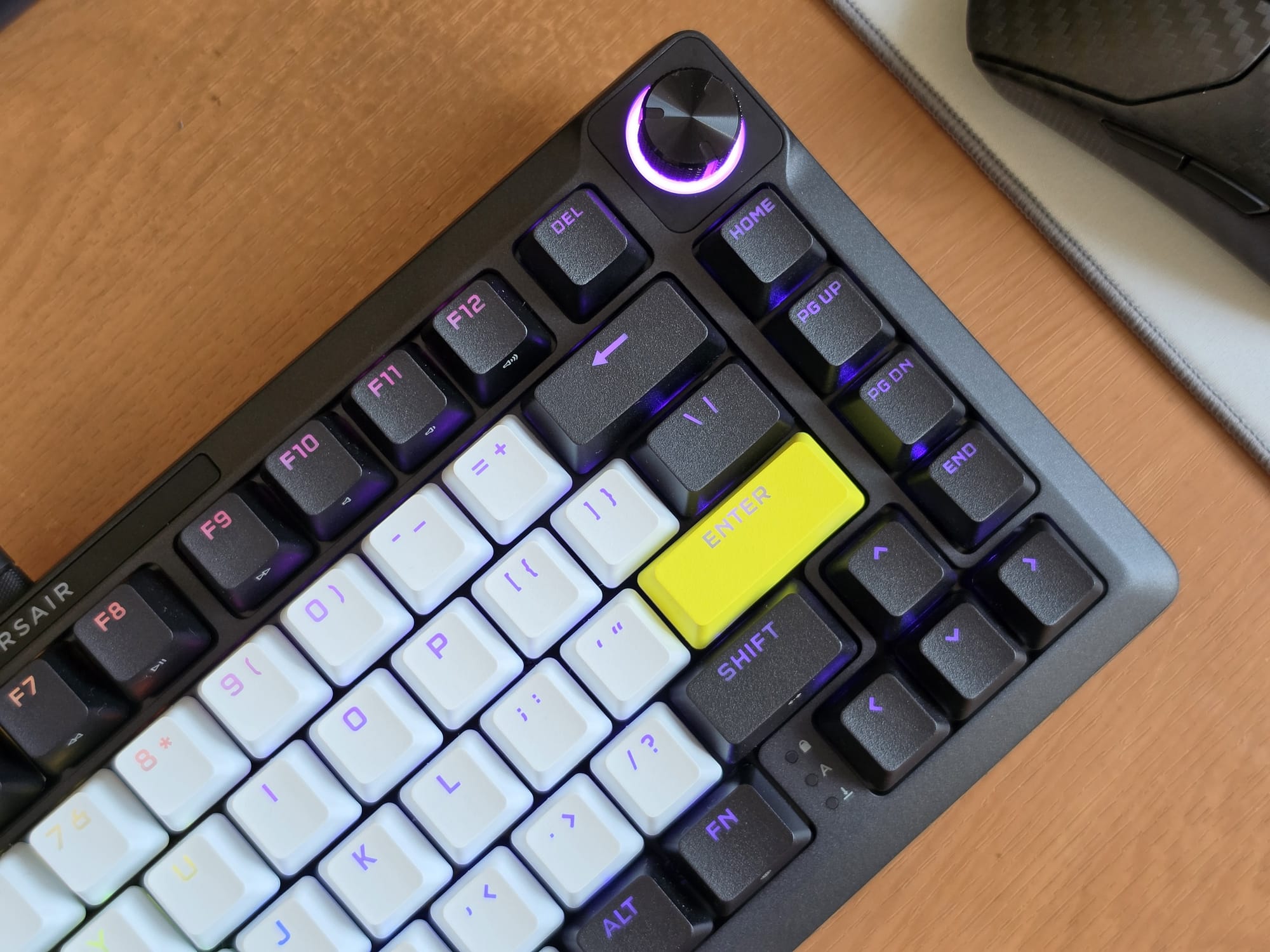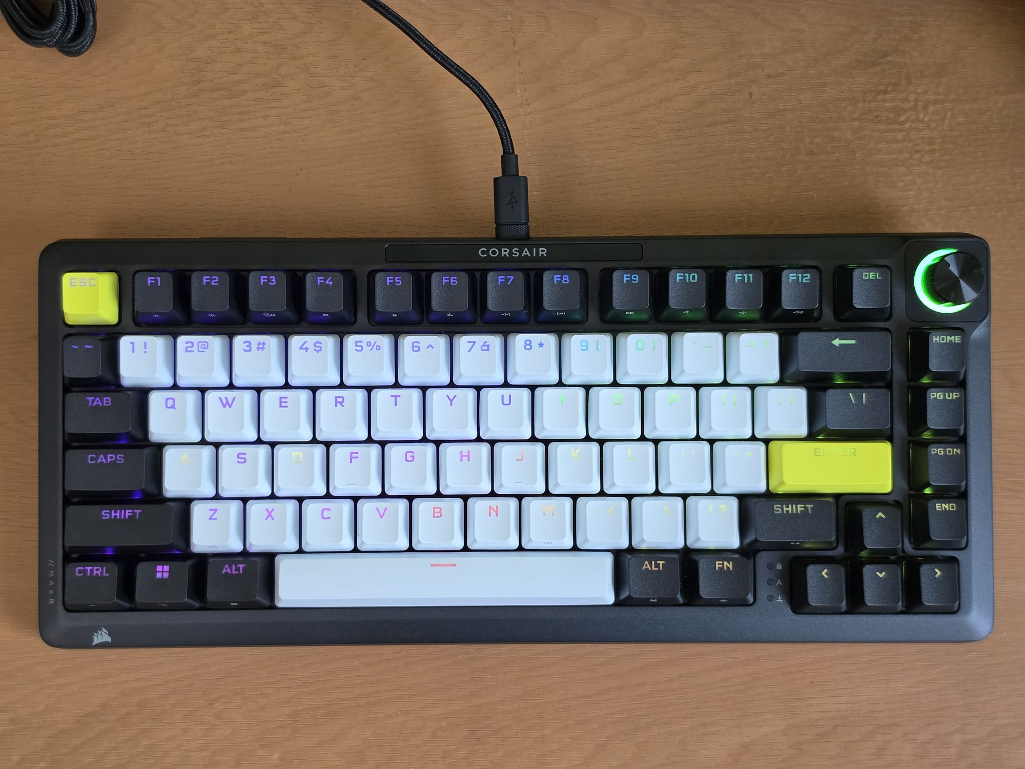 It uses a 75% layout, giving you the full alphanumeric block, a function row, arrow keys, and a column of navigation keys on the right side. There is a metal rotary knob in the top right corner with an RGB ring around it. The knob feels great to use, and I find the colour-coded ring a useful touch — it changes depending on the function you currently have assigned to it, so you always know what it is doing at a glance.