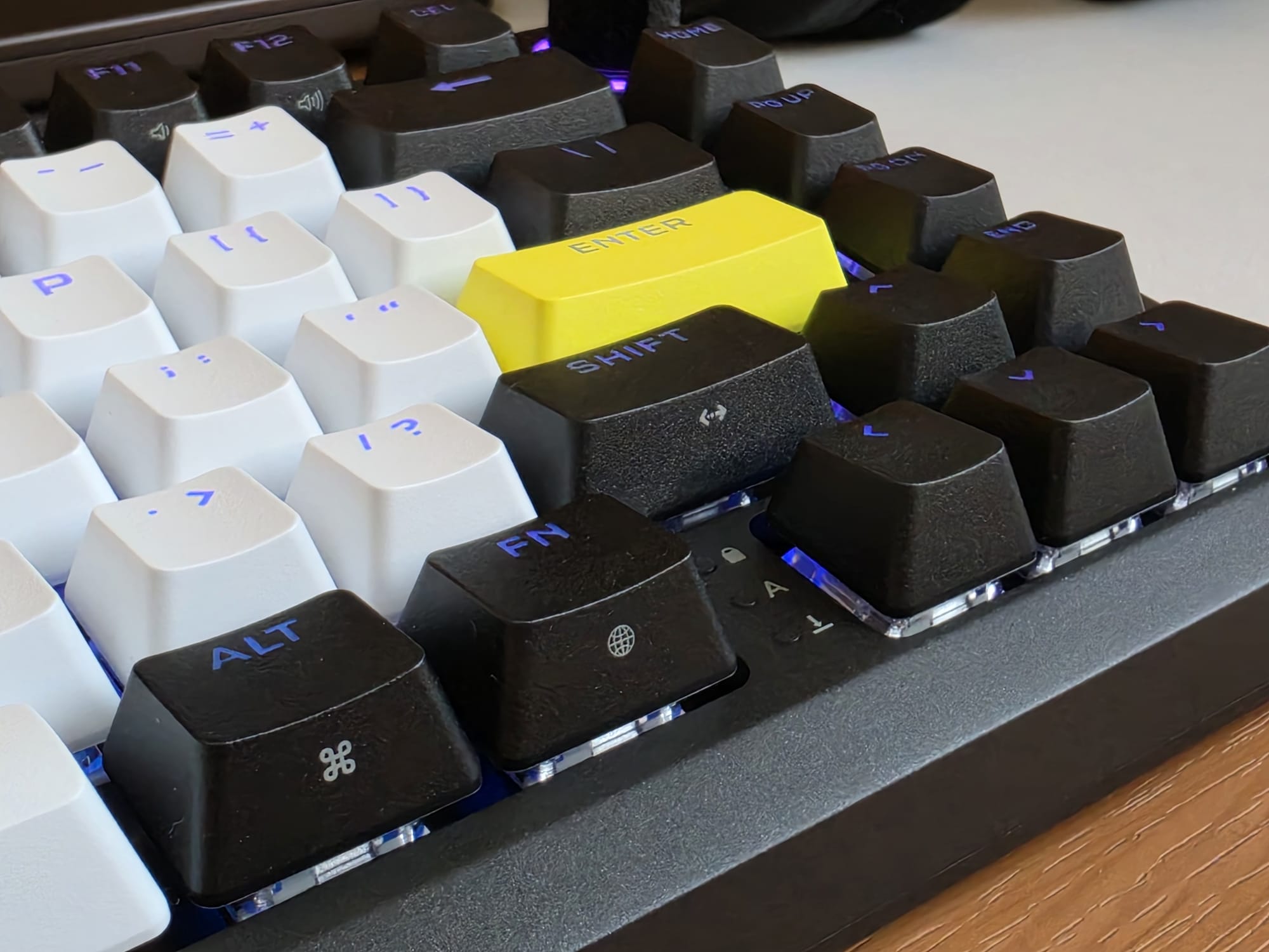 Moving on to the keycaps — they are double-shot PBT in a white, black, and yellow colourway. They look clean enough, but they feel noticeably light and a little hollow under the fingers. The texture is not particularly premium, and they feel out of place on a chassis this solid. They do provide enough grip and curvature for a stable gaming environment, though, and the legends are clear and shine through for a clean RGB setup.
