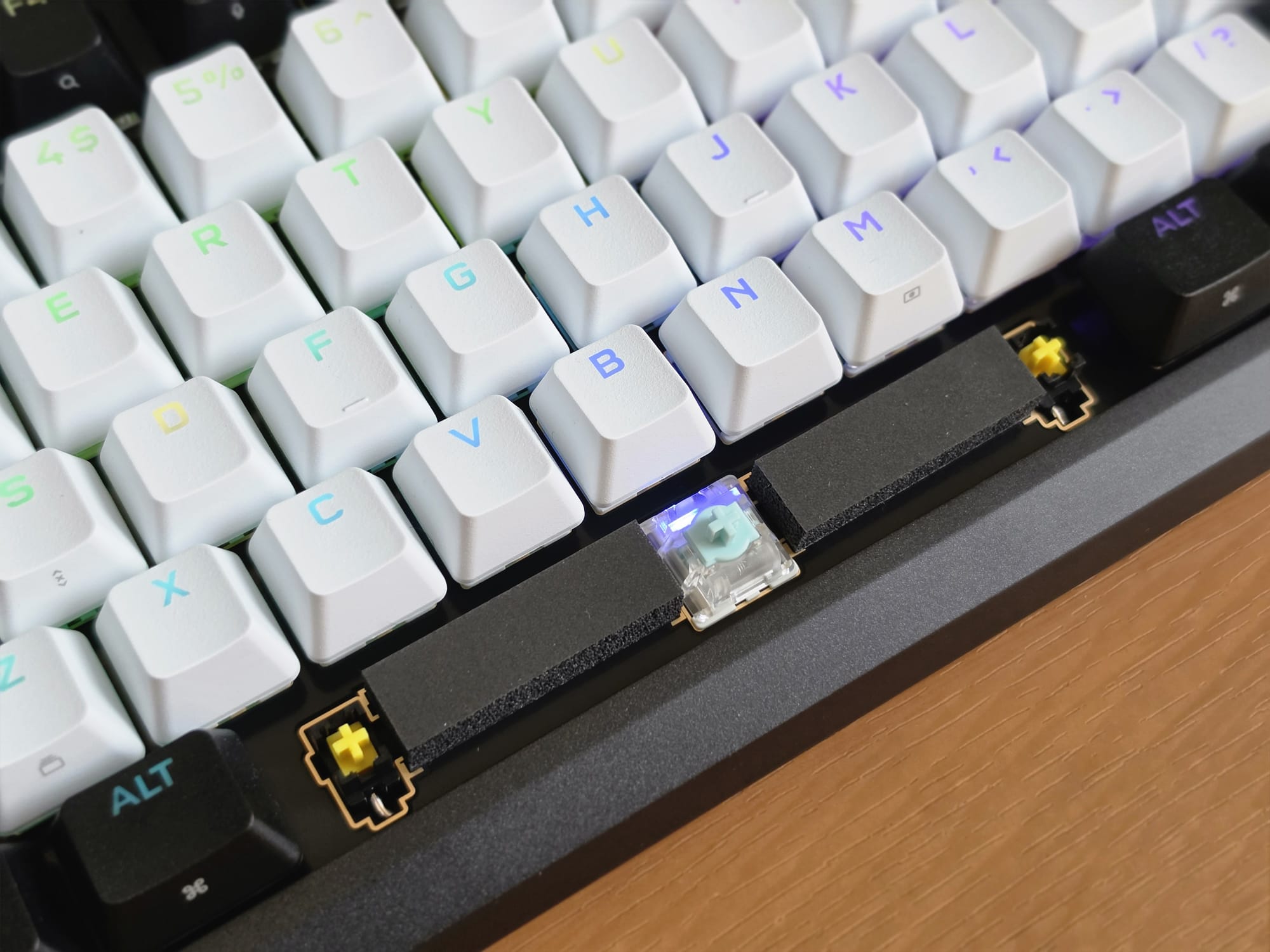 Unfortunately, the poor stabilisers have a direct knock-on effect on the sound profile of the entire keyboard. Corsair has packed eight layers of dampening material inside this keyboard — IXPE switch foam, socket foam, a silicon rubber pad, PU plate foam, and more — and despite all of that, the keyboard sounds average. It is not unpleasant, but it sounds scratchy and cheap. The dampening has done a reasonable job of reducing hollow resonance, but it cannot compensate for poorly tuned stabilisers, and that is what you hear every time you hit the spacebar or the backspace.