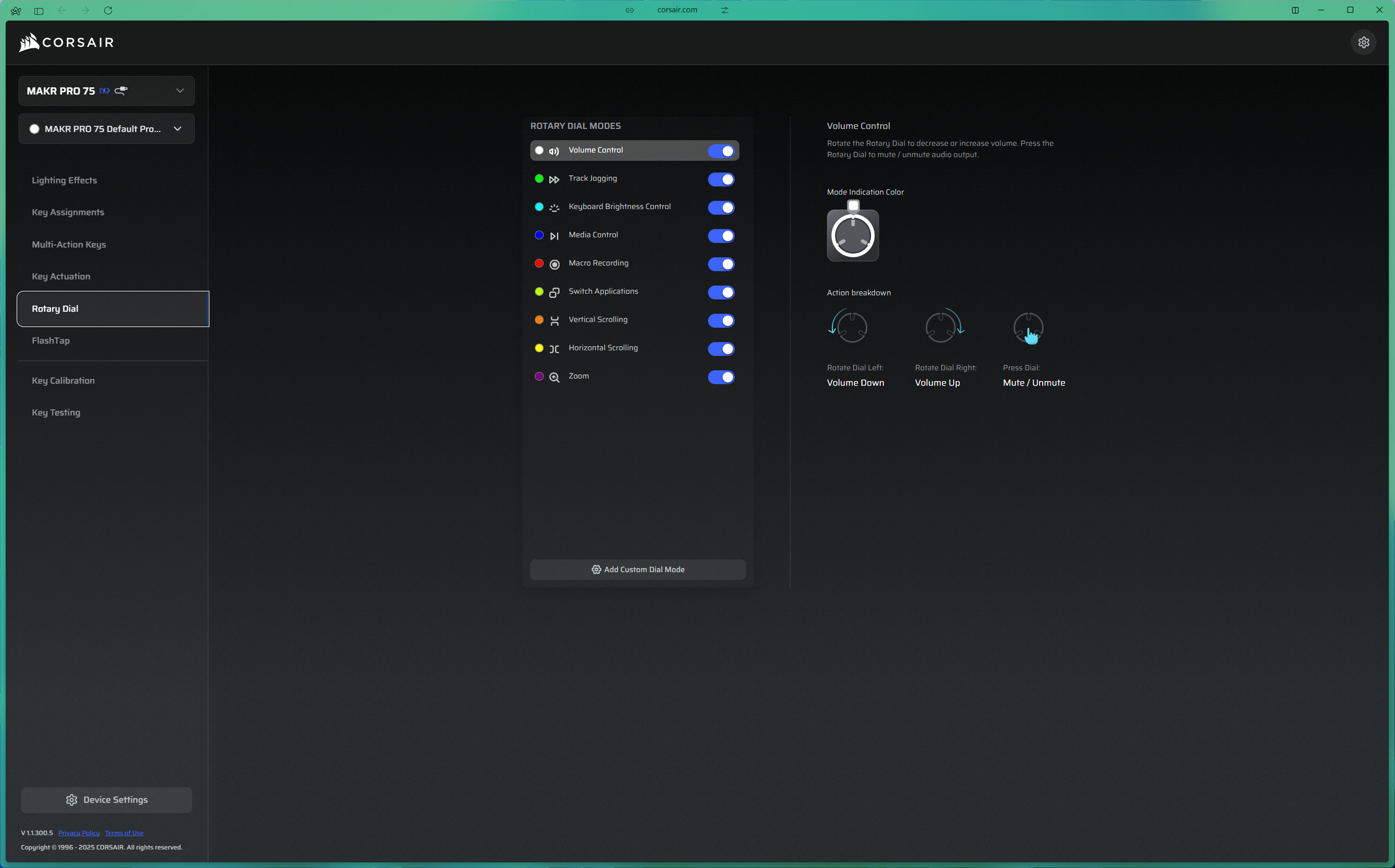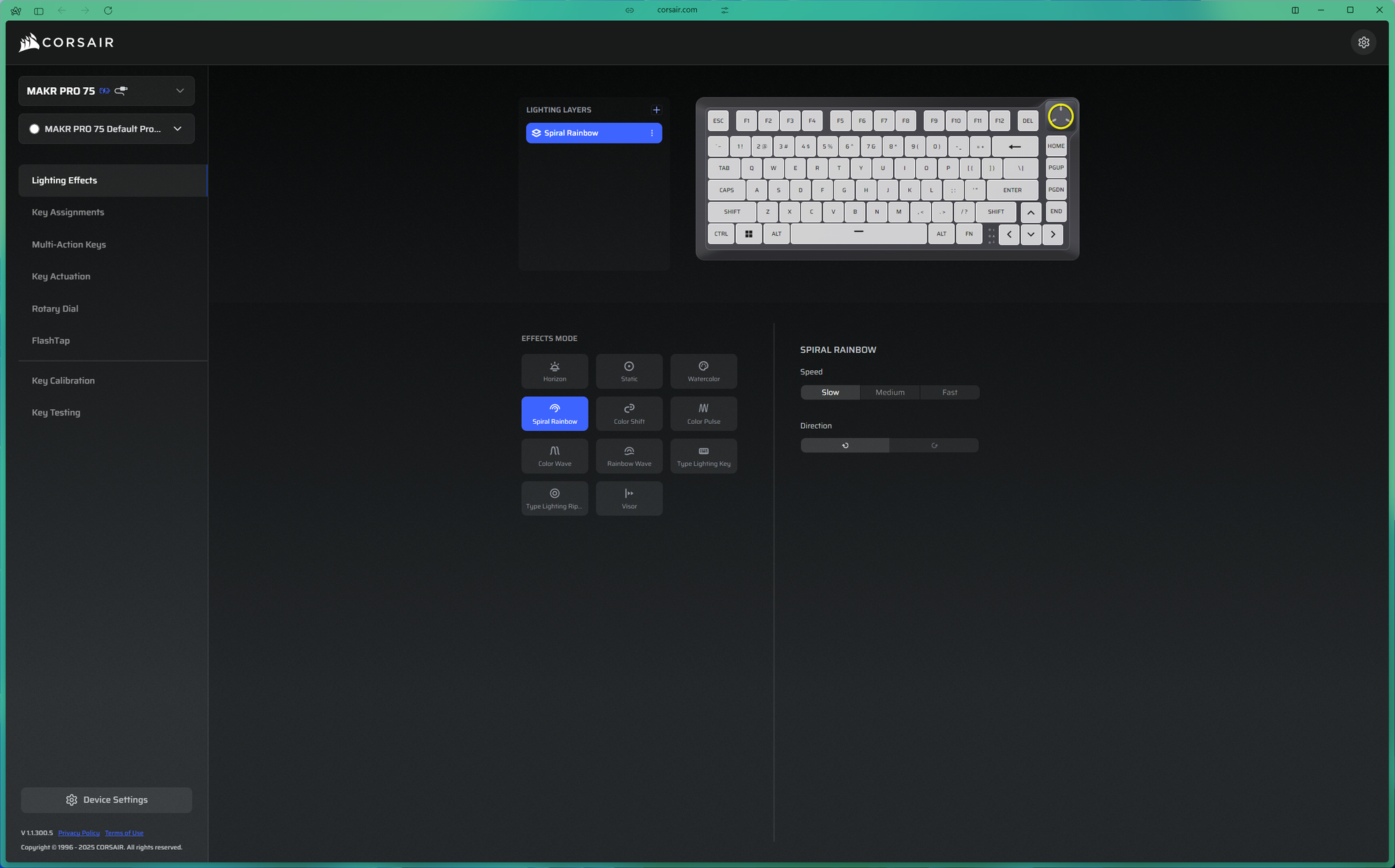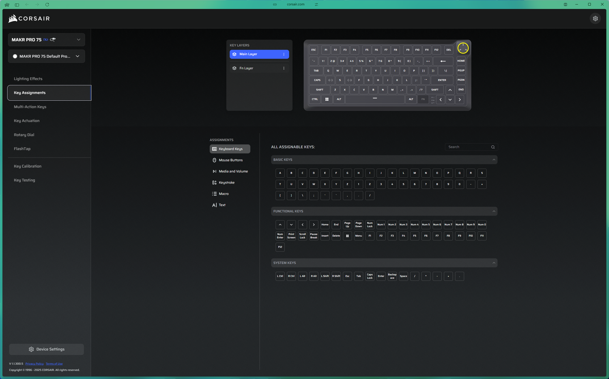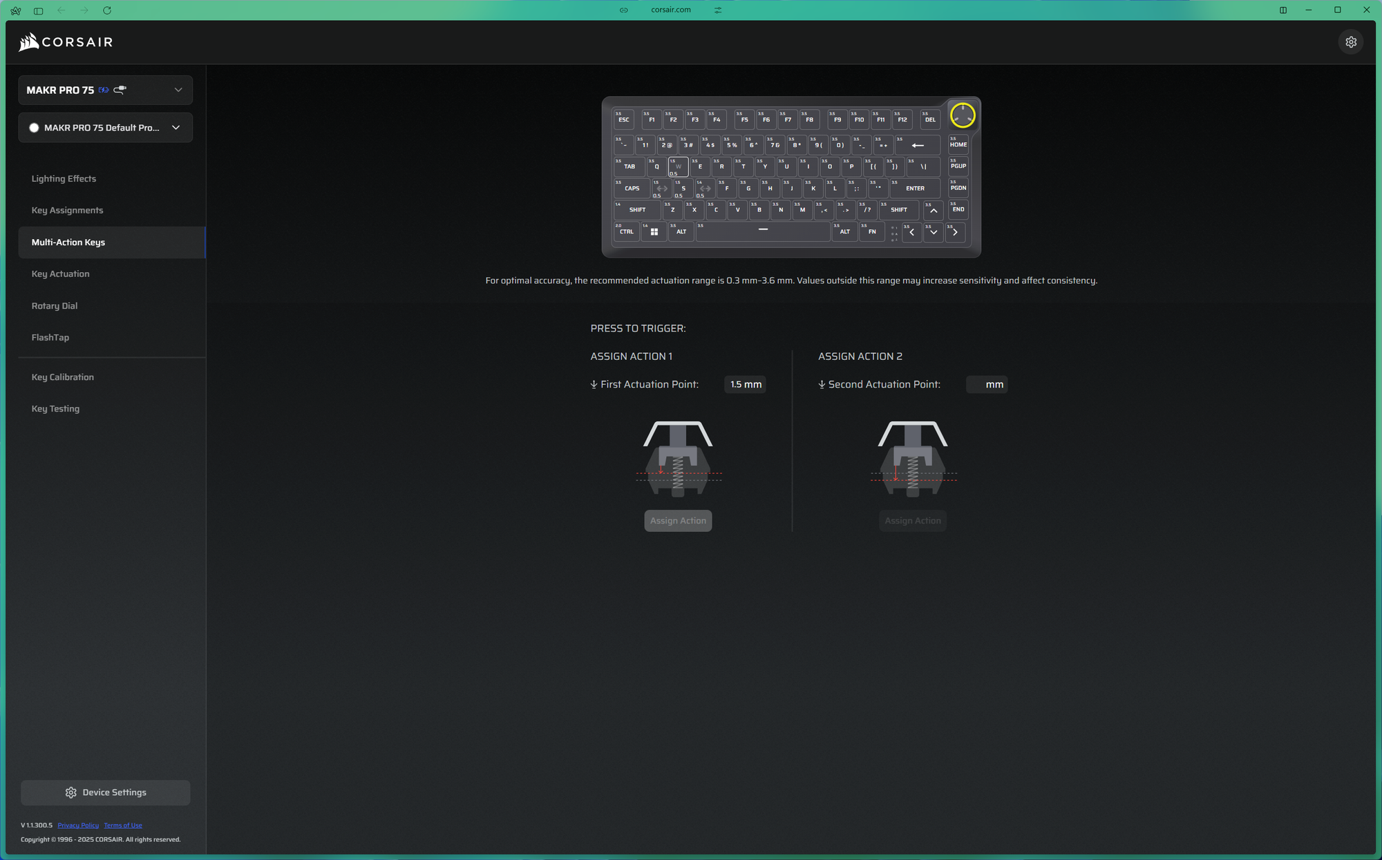 The software side of the MAKR Pro 75 is one of the areas where Corsair has done well. The Web Hub is a browser-based configuration tool that requires no installation — you just open it in a browser, connect the keyboard, and you are ready to go. It covers RGB lighting on a per-key basis, full key remapping, macro recording and assignment, and polling rate adjustment from 125Hz all the way up to 8,000Hz. All of this can be saved across five onboard profiles so the keyboard retains your settings even when disconnected. The interface is clean and well laid-out, and I found it approachable even for the more technical Hall Effect settings. However, the Web Hub only works on Windows. If you are on macOS, you are out of luck — a limitation the MAKR Pro 75 shares with Corsair's other recent peripherals, including the Sabre V2 Pro CF gaming mouse.