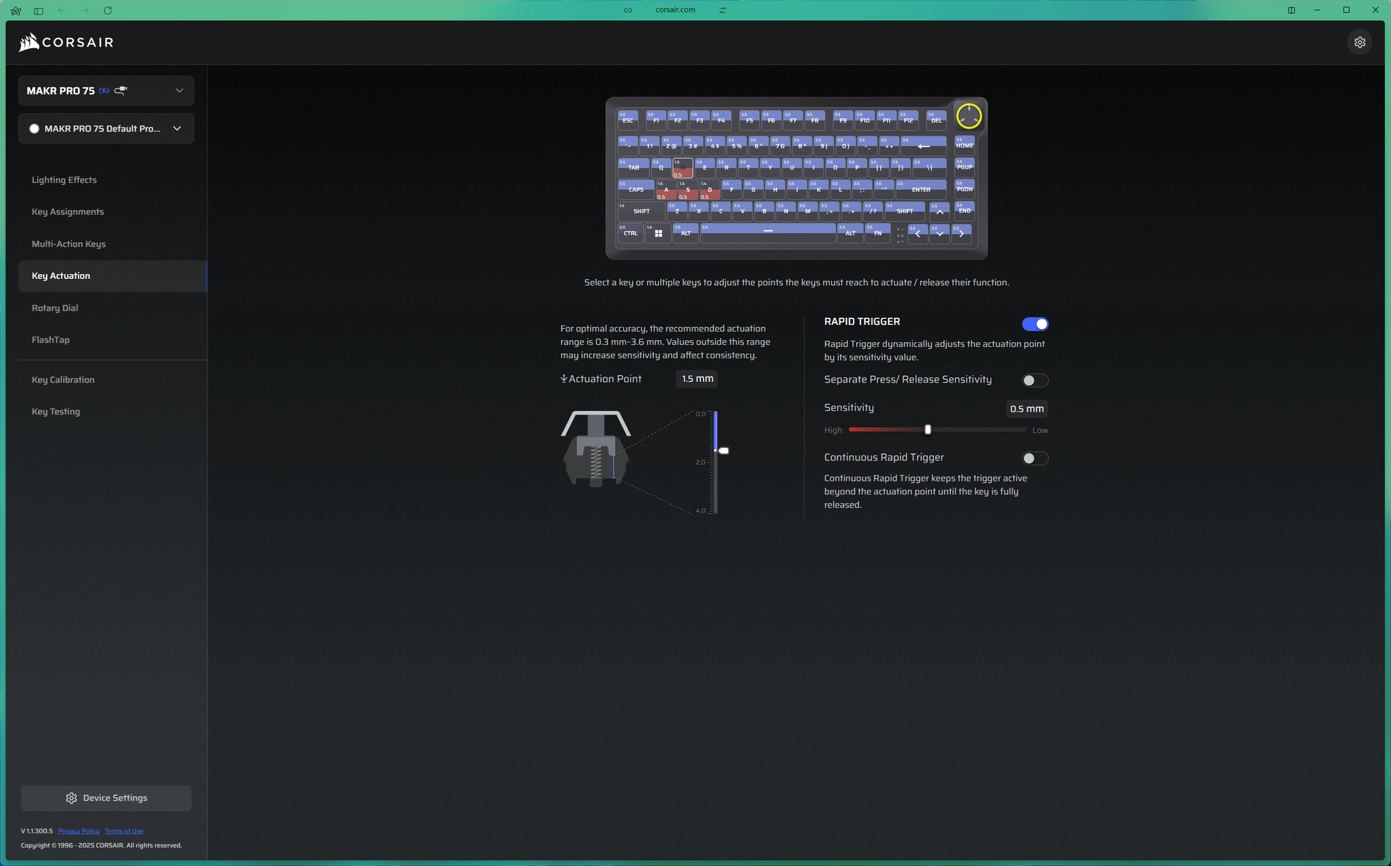 Rapid Trigger works well here. On a standard keyboard, there is a fixed actuation point and a fixed reset point, and the key has to travel back past the reset before it can fire again. With Rapid Trigger active, the reset is dynamic — as soon as you start lifting the key, the keyboard is ready for the next press regardless of where you are in the travel distance. This allows for much faster repeated keypresses with less physical movement, which in competitive gaming translates to quicker execution. It is a well-implemented feature and works as expected.