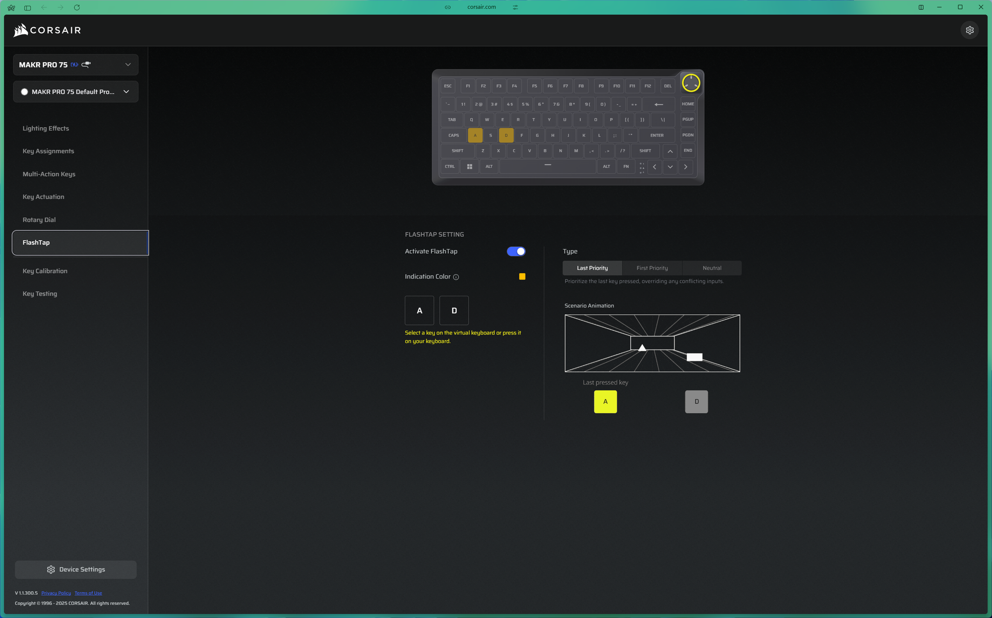 FlashTap is the feature I found most interesting on the MAKR Pro 75. It addresses SOCD — Simultaneous Opposing Cardinal Directions — which occurs when two conflicting directional inputs are held simultaneously. If you hold A to move left and press D while still holding A, most keyboards will have both inputs cancel each other out. FlashTap lets you configure how the keyboard resolves that conflict: you can prioritise the most recently pressed key, the first pressed key, or let it resolve neutrally.