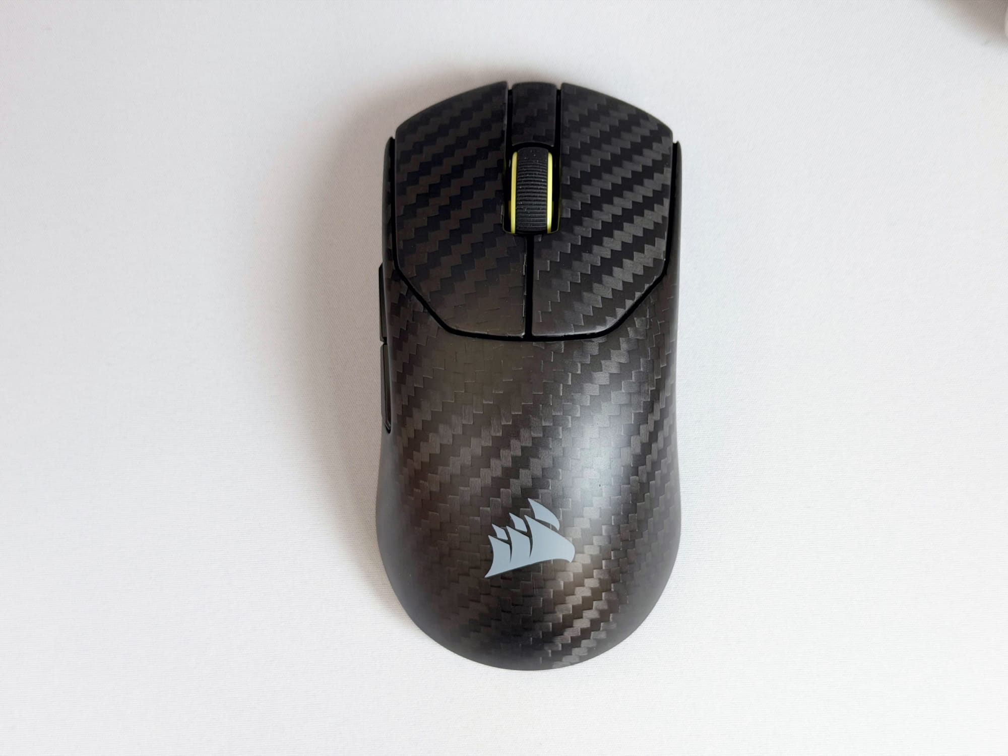 It's not so slippery that you feel like the mouse might escape your grip mid-game; the texture of the carbon fiber weave provides just enough natural friction for confident control. For more intense sessions where sweat might become a factor, Corsair includes pre-cut grip tape in the box, and it's pretty good quality - once applied, it adds meaningful stickiness without feeling cheap or plasticky.