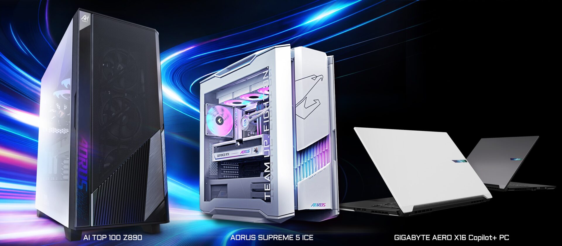 - New AI laptops: AERO X16, GAMING A16, AORUS MASTER 16/18 with GiMATE AI Agent and RTX 50 Series Laptop GPUs.
