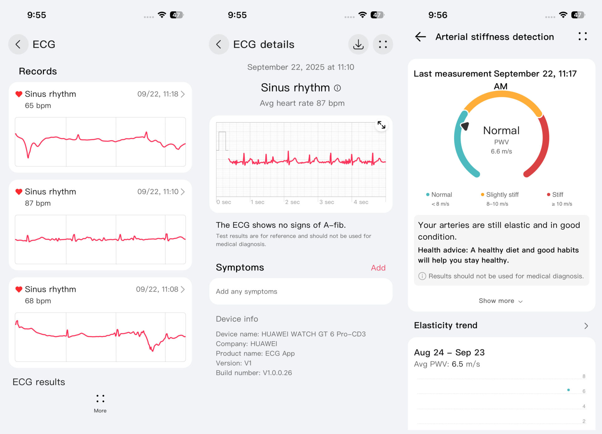 The comprehensive health monitoring suite includes standard metrics like heart rate, SpO2, and stress tracking, plus more advanced features like ECG readings and arterial stiffness measurements. The ECG functionality allows you to take readings by resting your finger on the lower right button for 30 seconds, and you can export the results as PDFs to share directly with your doctor via email. The arterial stiffness measurements can indicate stroke risk and cardiovascular conditions, making this a useful health monitoring tool.