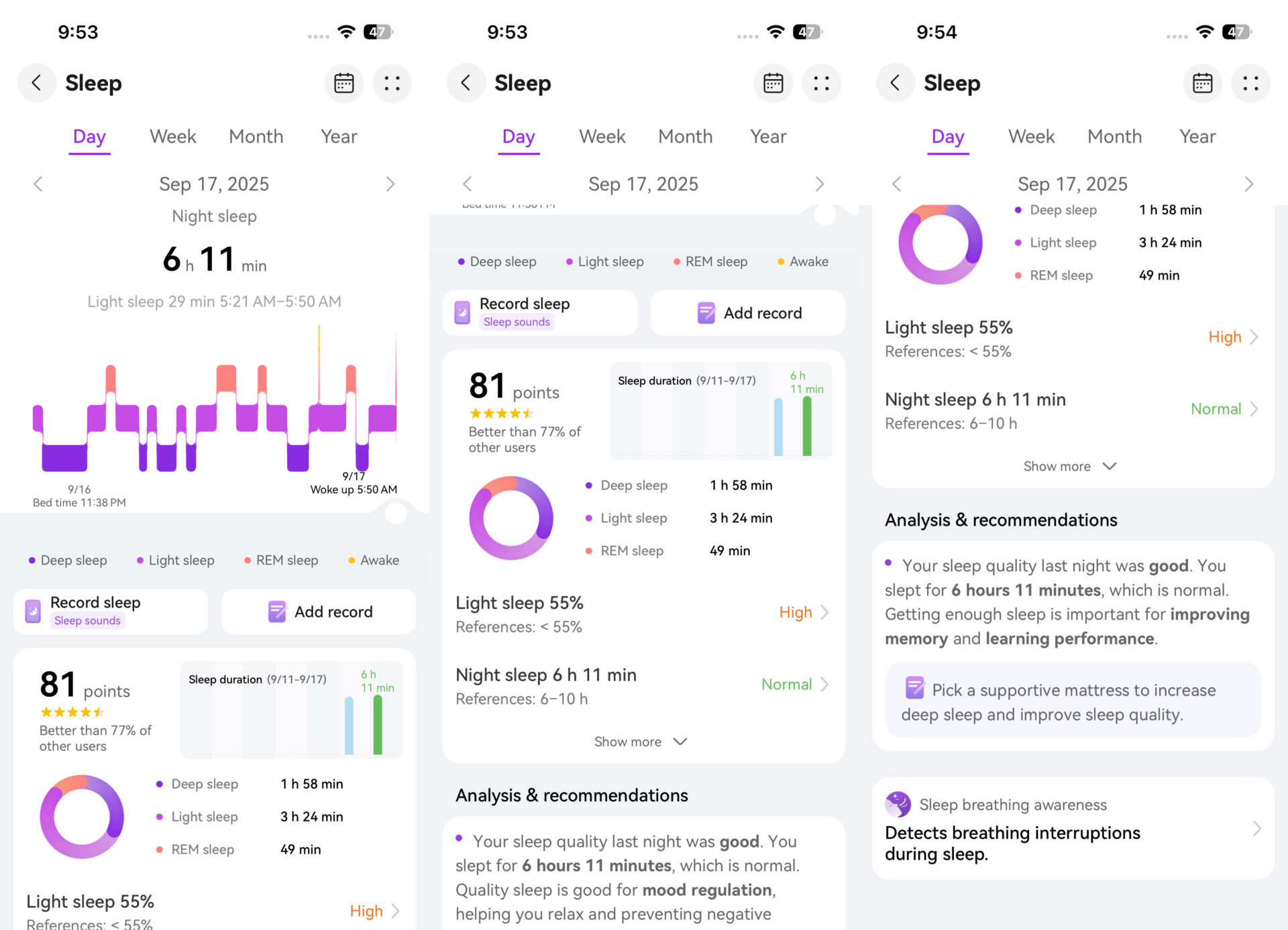 Sleep tracking is well-implemented and goes beyond basic stage detection. The watch recognizes different sleep stages based on heart rate, blood oxygen levels, and movement patterns during the night, providing an aggregated sleep score in the morning along with practical suggestions for improvement. The new HRV integration helps identify potential breathing irregularities and conditions like sleep apnea, though this shouldn’t replace proper medical evaluation.