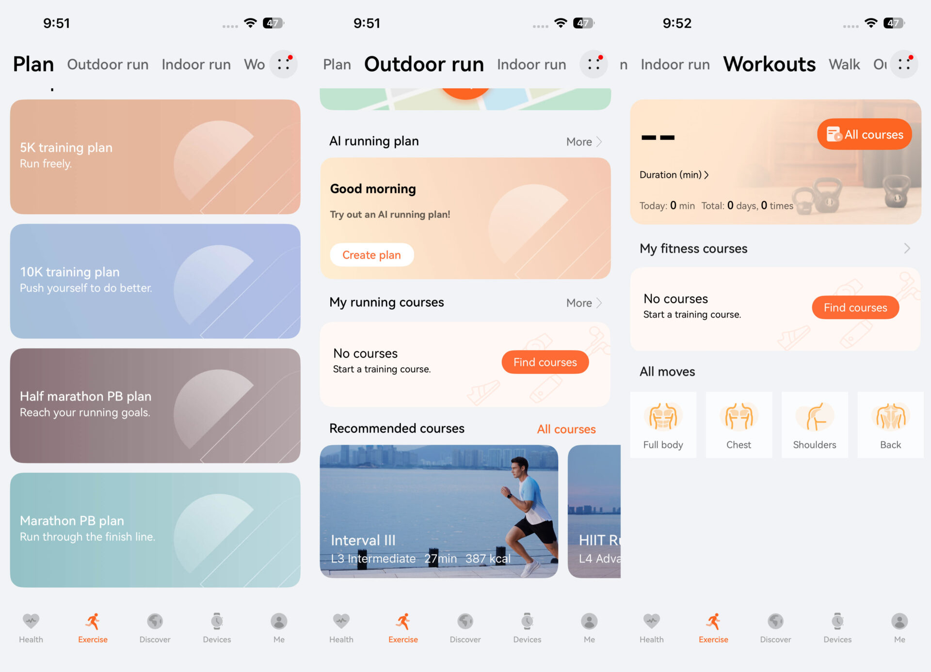 Runners get comprehensive features including training plans for marathons and half-marathons, detailed metrics like VO2 Max, HRV, vertical oscillation, stride length, ground contact time, and balance analysis. The auto-detec feature works well for running too, and you can preview gradient profiles of planned routes, which is useful for trail running preparation.