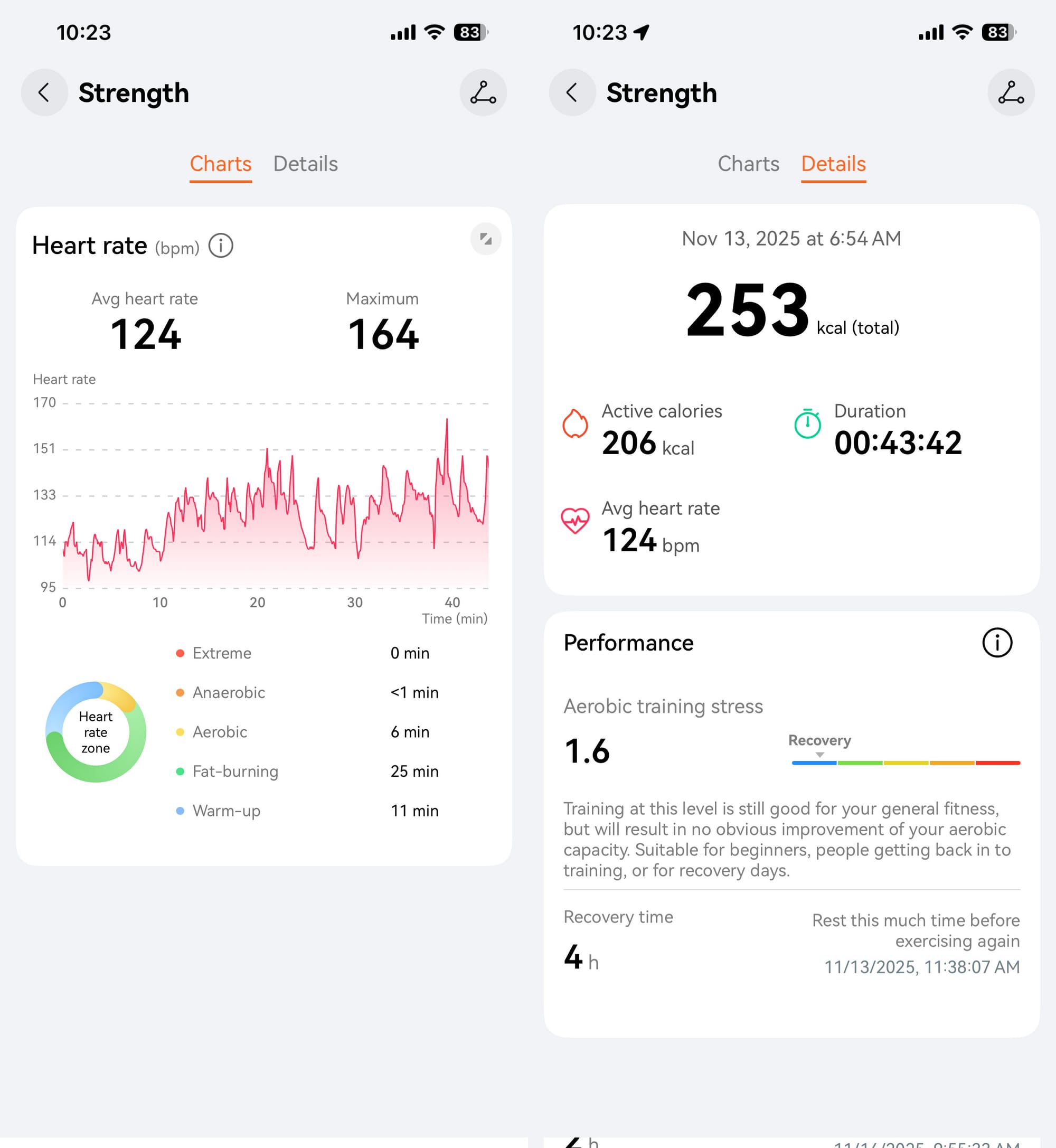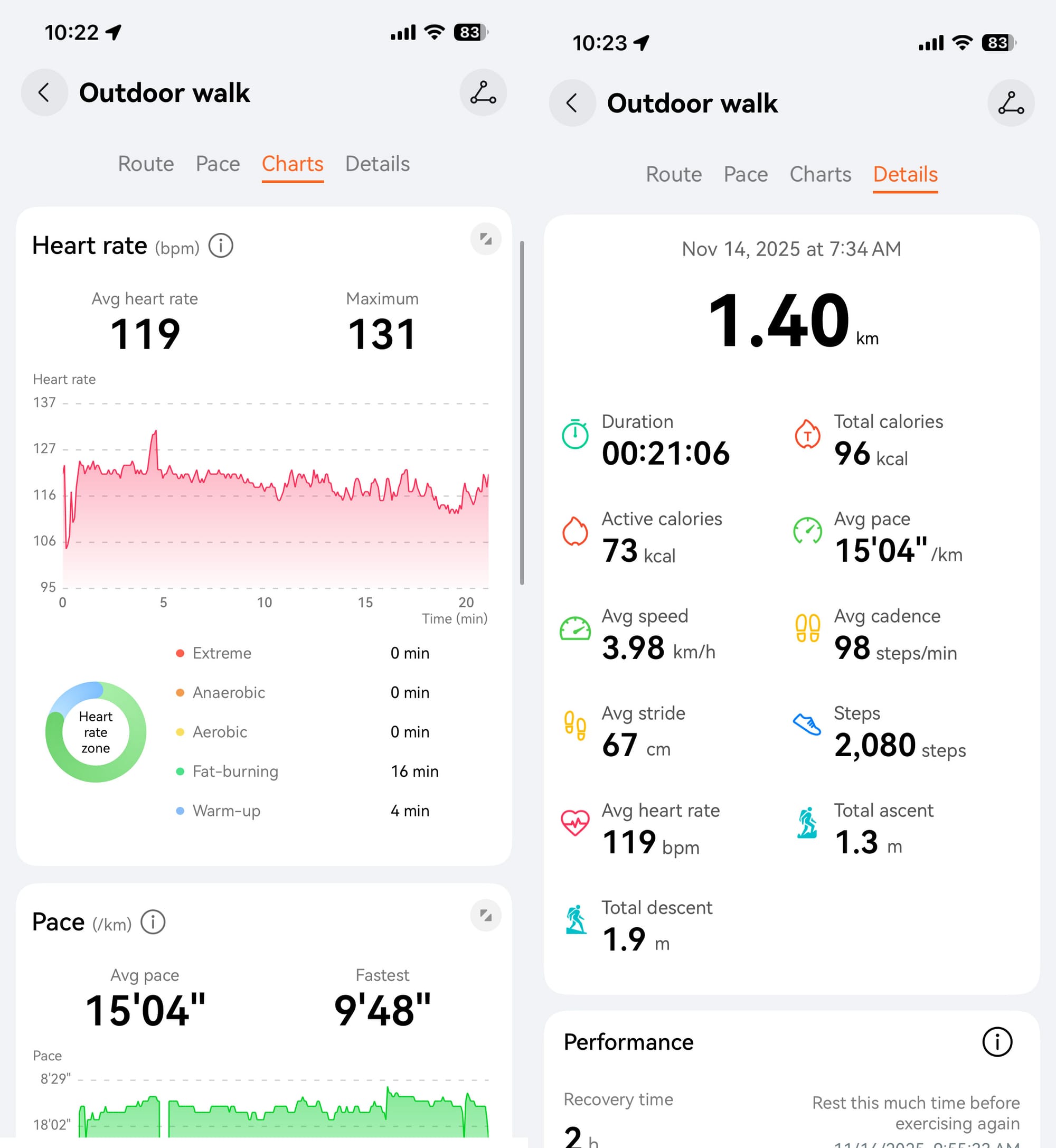 The workout summaries for walks are detailed enough: pacing, heart rate zones, elevation, cadence and maps are all there. For weight lifting, the watch tracks sets, heart rate and basic timing reliably. There isn’t a ton of smart rep recognition or exercise-specific analysis going on, but for logging time, heart rate and overall effort, it works as expected, and the graphs in the app are clean and readable.