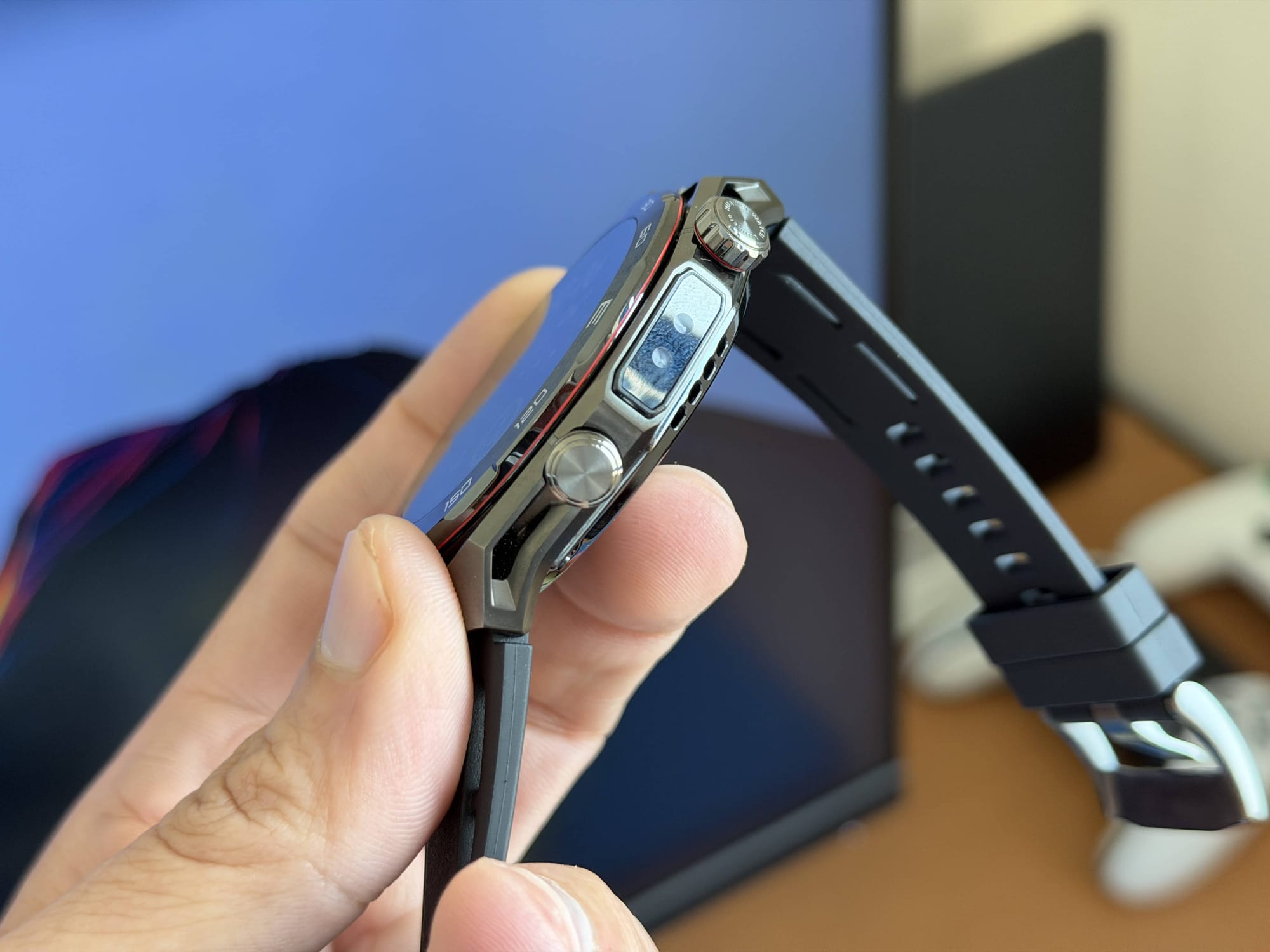 On the left, there’s another programmable button. Between the crown and the right-hand button is Huawei’s new X-Tap sensor, which you can touch to run quick health scans. The three-button setup works well in daily use: the crown handles scrolling and list navigation, the lower right button is typically mapped to workouts or dive tools, and the left button is a handy shortcut to whatever you use most (default function launches the workout apps, which is what I prefer anyways).