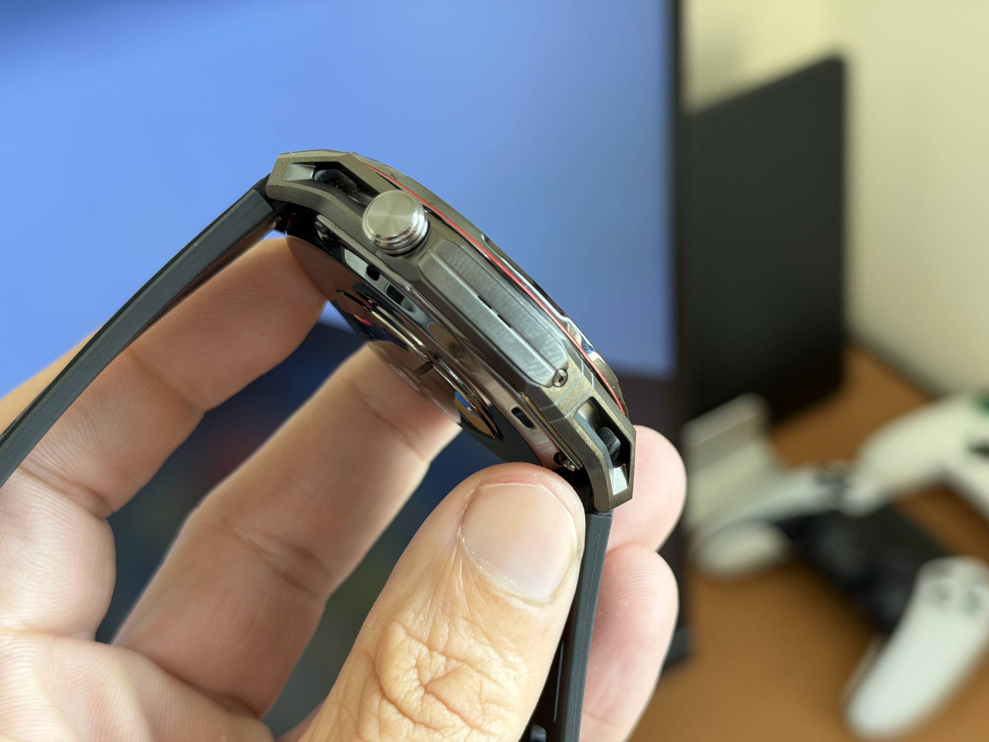 The button layout is straightforward and practical. On the right side, you get a rotating crown on top and a secondary shortcuts button under it.
