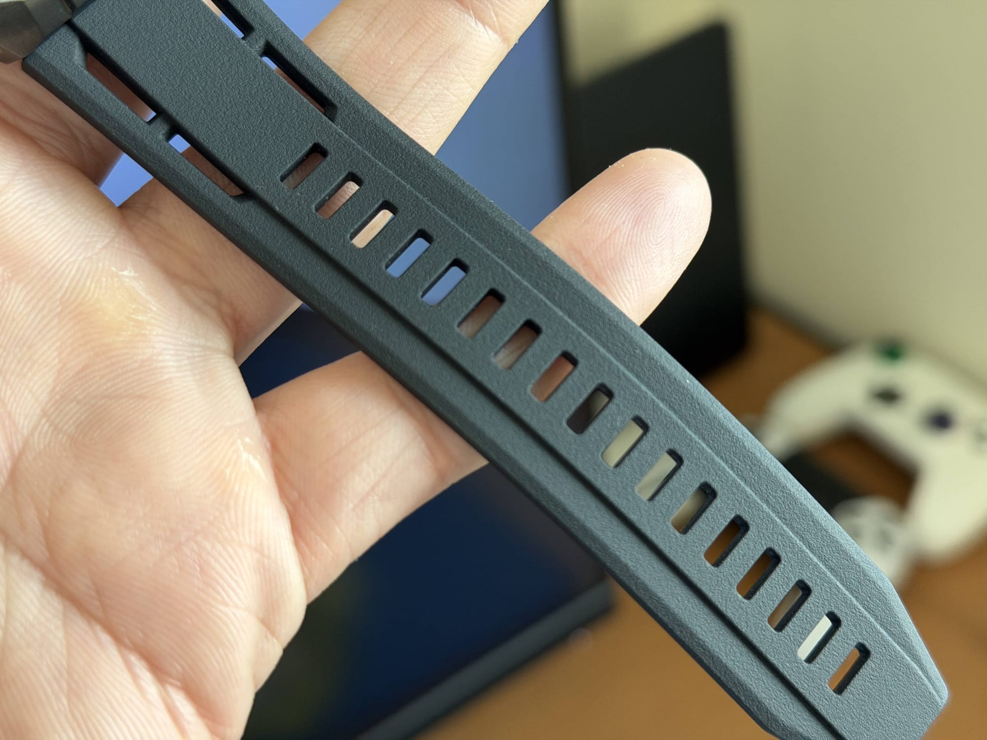 It’s available in Black (fluoroelastomer strap, the one we received) and Blue (titanium bracelet plus extra rubber straps), with case sizes of 48.5mm and 47.8mm, respectively. The weight sits just over 80g without a strap, which is exactly how it feels: dense and substantial rather than plasticky or hollow.