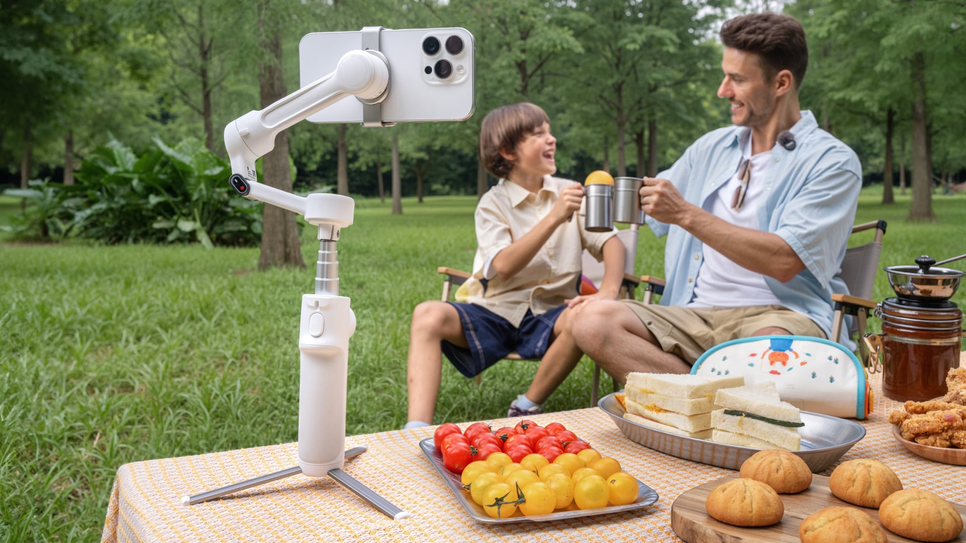 The gimbal folds down for portability, making it suitable for creators on the go. The tripod and selfie stick are seamlessly built in, supporting stable shots and versatile angles during solo filming or group videos.