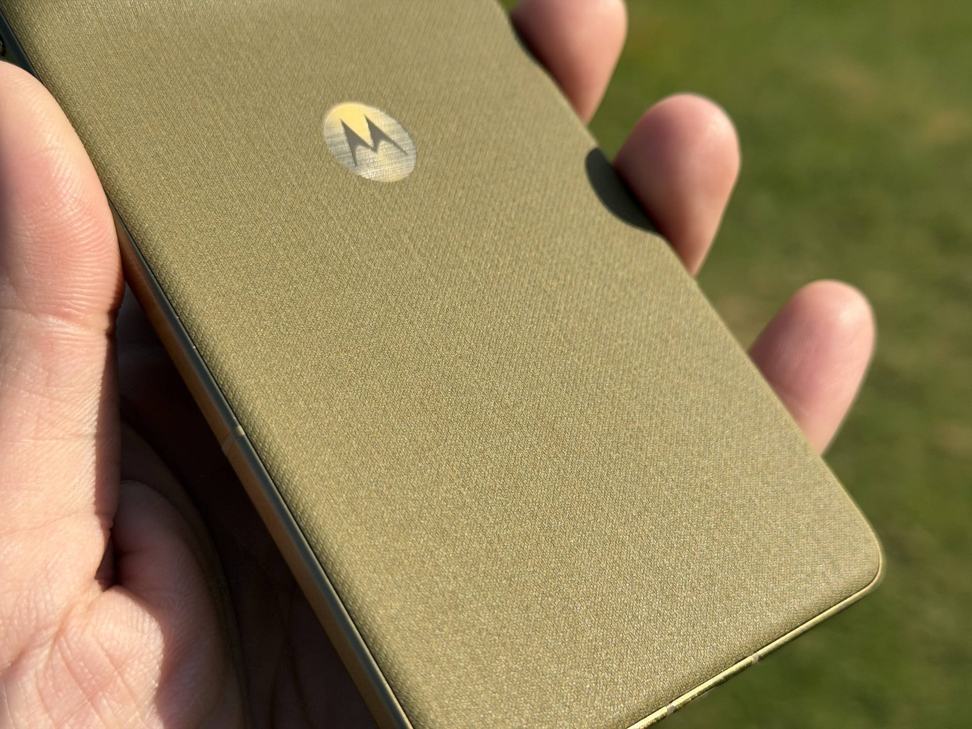 Speaking of that colour, I am usually not a fan of green or olive colourways on tech products. But somehow, Motorola makes it work here. It is unique and different from the standard monochromatic sea of black-and-silver phones, and it isn’t as loud as the bright orange and blue ones. It has a fresh, almost too professional presence, as if designed for the suited and booted among us. The cloth-like texture of the back adds a whole lot to this appeal, and the slight pattern gives it an extra bit of flair that feels very sophisticated to the touch.