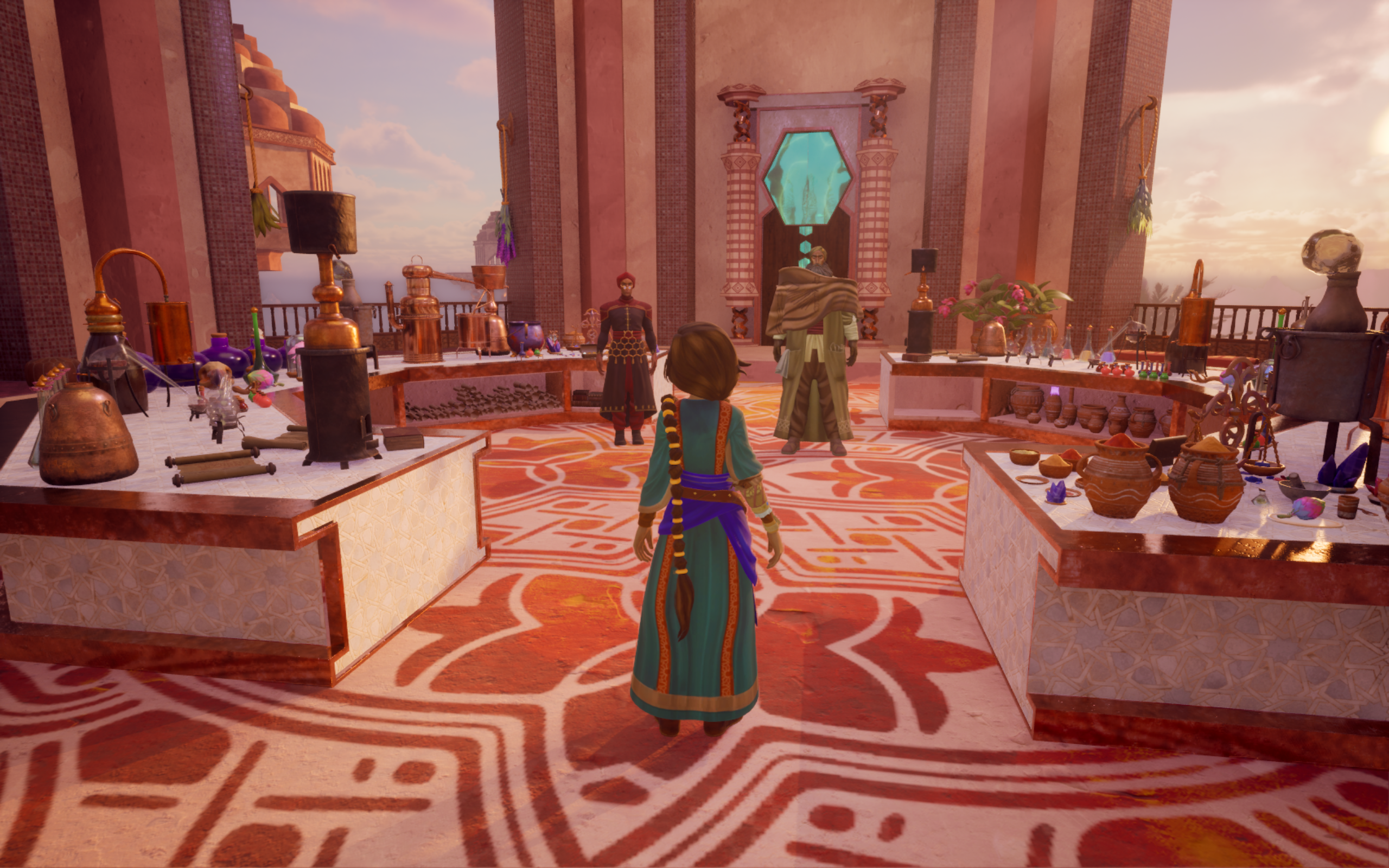 You walk past intricate carpets and ouds resting casually on cushions, but they are flanked by glass alembics bubbling with strange liquids and scattered scrolls. The lighting does a lot of heavy lifting here, bathing the geometric architecture in a warm, sunset glow.