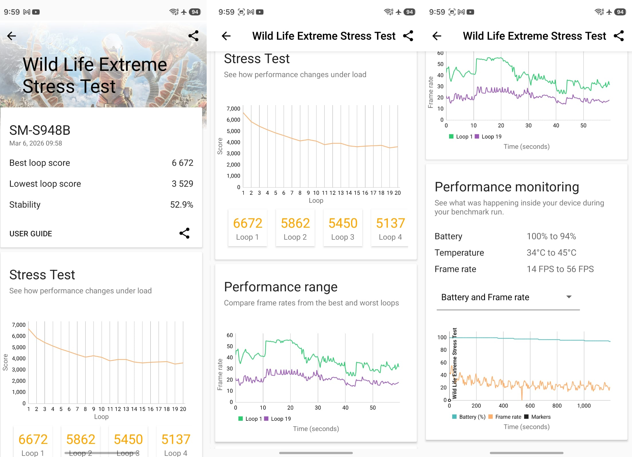 We also ran a dedicated stress test to see if that new cooling solution actually works. High peak performance is great, but it usually comes at the cost of stability. The S26 Ultra handles this trade-off reasonably well. While it does eventually throttle under sustained heavy load to protect the components, the descent is gradual rather than a sudden cliff.
