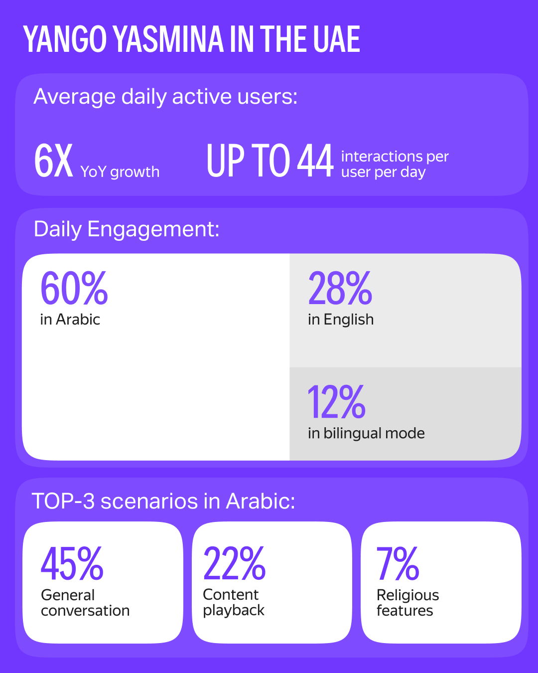 Arabic is the preferred language for the majority of Yango Yasmina users in the UAE. Aggregated data reveals that 60% of daily users primarily engaged with the AI assistant in Arabic during Q4 2025, underscoring the importance of localisation in consumer tech.